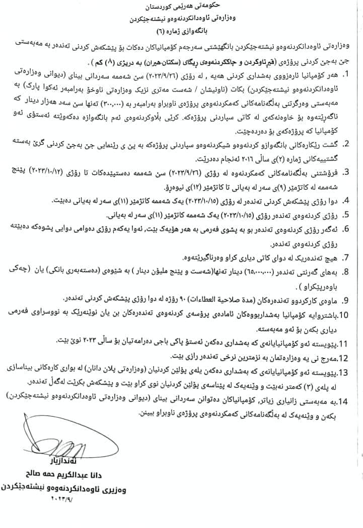 ئاگەهدارییەک ژ وەزارەتا ئاڤەدانکرن و نیشتەجێکرنێ بو گشت کومپانیان ل دور ئەنجامدانا دو پروژان